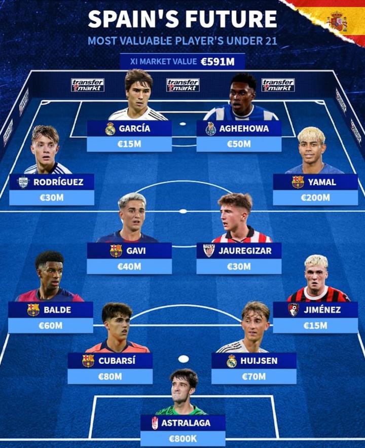 亚马尔(效力于巴塞罗那)身价2亿欧元、豪雷吉萨尔(效力于毕尔巴鄂竞技)身价3000万欧元、加维(效力于巴塞罗那)身价4000万欧元、赫苏斯-罗德里格斯(效力于科莫)身价3000万欧元